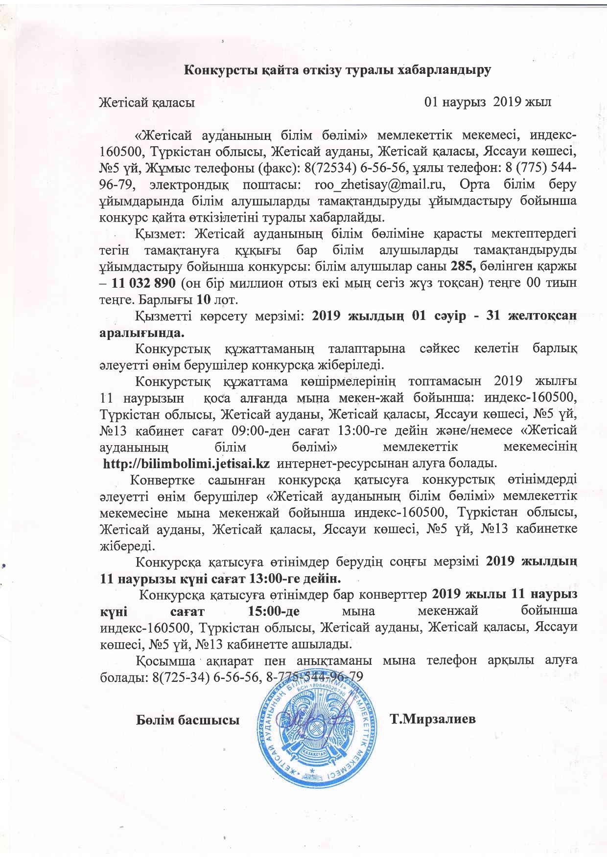 КОНКУРСТЫ ҚАЙТА ӨТКІЗУ ТУРАЛЫ ХАБАРЛАНДЫРУ